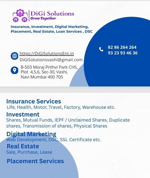 DiGi Solutions Enterprises was become operational since 2015. DiGi Solutions Enterprises is having business operations in the fields of Investment & Insurance Advisory, Digital Marketing, eCommerce, Web Development, DSC & SSL Certificates, Placement & Professional Services, Homemade products, Tours & Travels, Money making ideas, Art & Crafts and Training for your Growth.