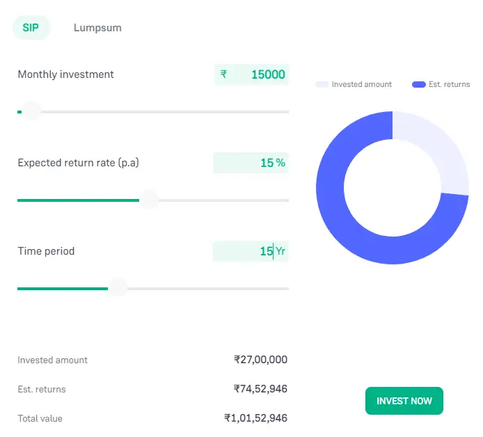 In the above SIP-15-15-15 when you will be investing Rs. 15,000 for 15 years and expected return 15% p.a. *(which generally equity in India gives) , then against your investment of Rs. 27,00,000 you will get return of Rs. 74,52,946 and your Corpus will be of Rs. 1,01,52,946*