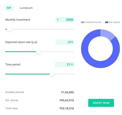 In the above two illustration No 2 when you will be extending investing Rs. 3000 for 15 years + 6 more years and expected return 15% p.a. (which generally equity in India gives) , then against your investment of Rs. 7,56,000 you will get return of Rs. 45,62,018 and your Corpus will be of Rs. 53,18,018.